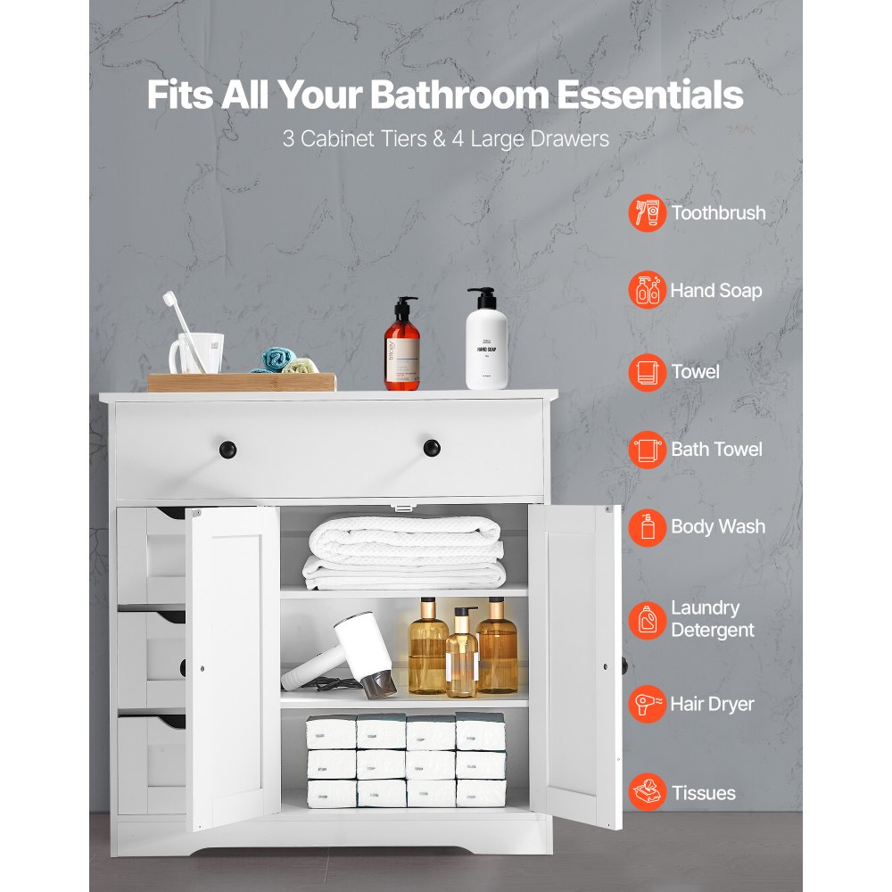Armario de Baño de 4 Niveles de Almacenamiento de Madera con 2 Puertas, 4 Cajones y Estante Ajustable, Moderno e Independiente, a Cocina, Salón o Entrada, Resistente al Agua, Color Blanco - Fontanería