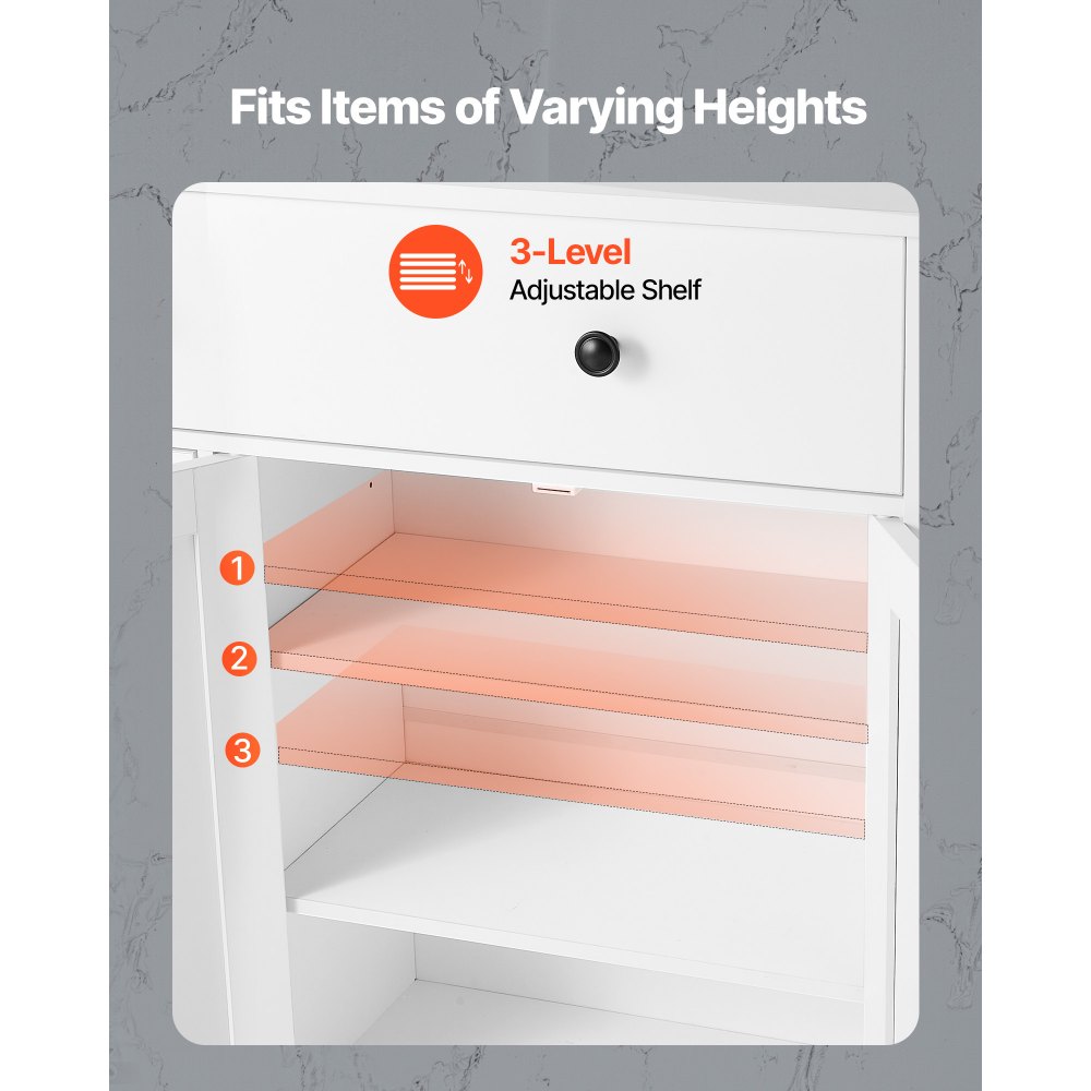 Alturas de estante ajustables: Equipado con orificios pretaladrados, el armario de almacenamiento de piso para baño ofrece tres niveles de altura para personalizar la separación entre los estantes. Es ideal para almacenar artículos de diferentes tamaños con facilidad