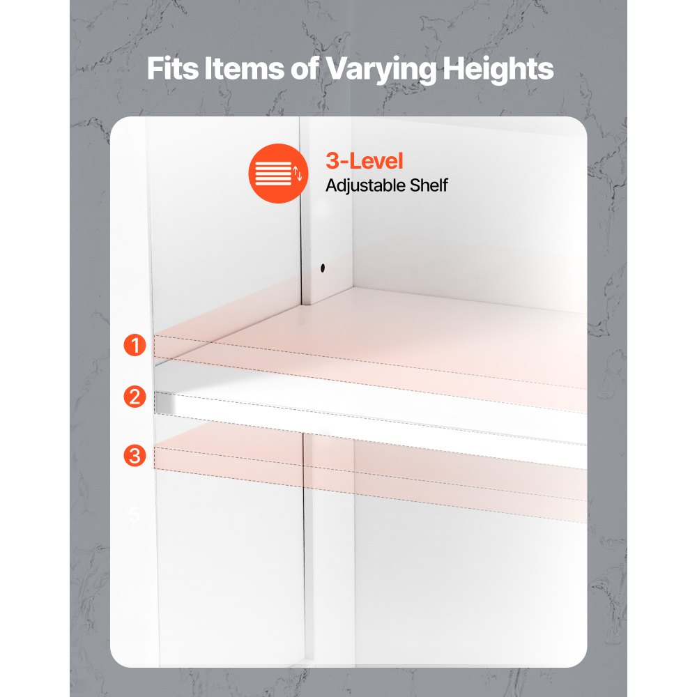 Alturas de estante ajustables: Equipado con orificios pretaladrados, el armario de almacenamiento de piso para baño ofrece tres niveles de altura para personalizar la separación entre los estantes. Es ideal para almacenar artículos de diferentes tamaños con facilidad