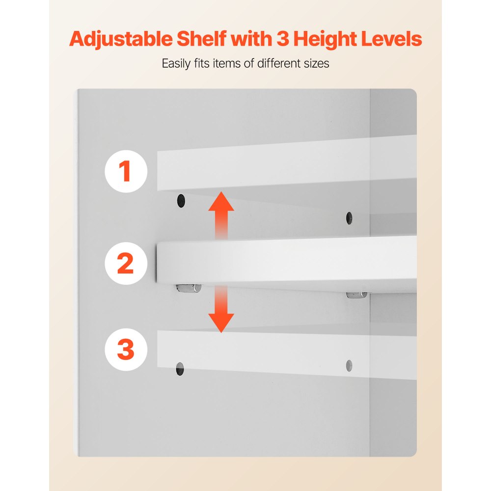 Estante ajustable: El botiquín de pared cuenta con un estante ajustable con 3 niveles de altura, lo que permite ajustarlo libremente para acomodar artículos de diferentes alturas. Su diseño flexible se adapta a diferentes necesidades de almacenamiento y optimiza el espacio del baño