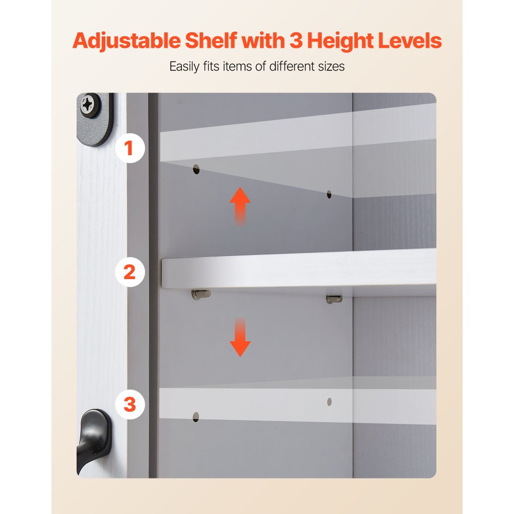 Estante ajustable: El armario de pared cuenta con un estante ajustable con 3 niveles de altura, lo que permite ajustar libremente la altura de los artículos. Su diseño flexible se adapta a diferentes necesidades de almacenamiento y optimiza el espacio del baño