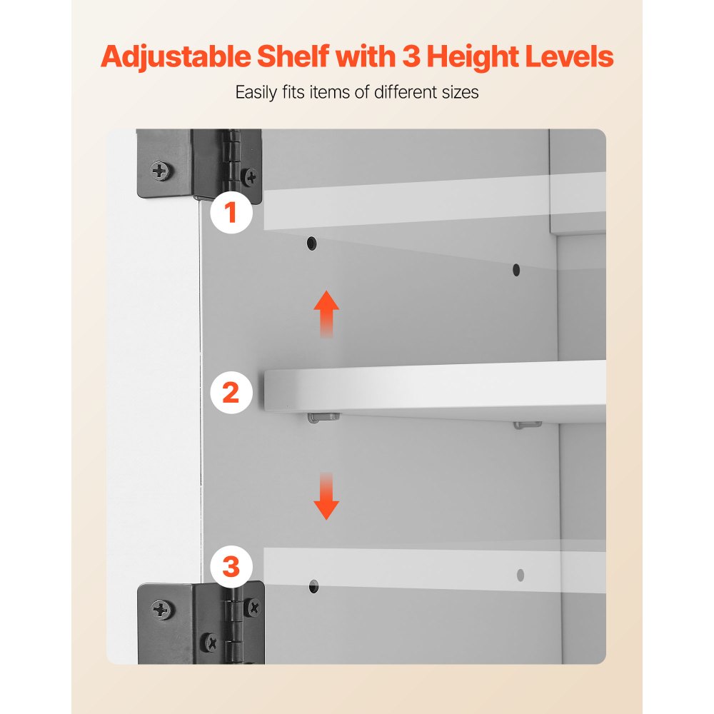 Estante ajustable: El mueble de baño de pared cuenta con un estante ajustable con 3 niveles de altura, lo que permite ajustar libremente la altura de los artículos. Su diseño flexible se adapta a diferentes necesidades de almacenamiento y optimiza el espacio del baño