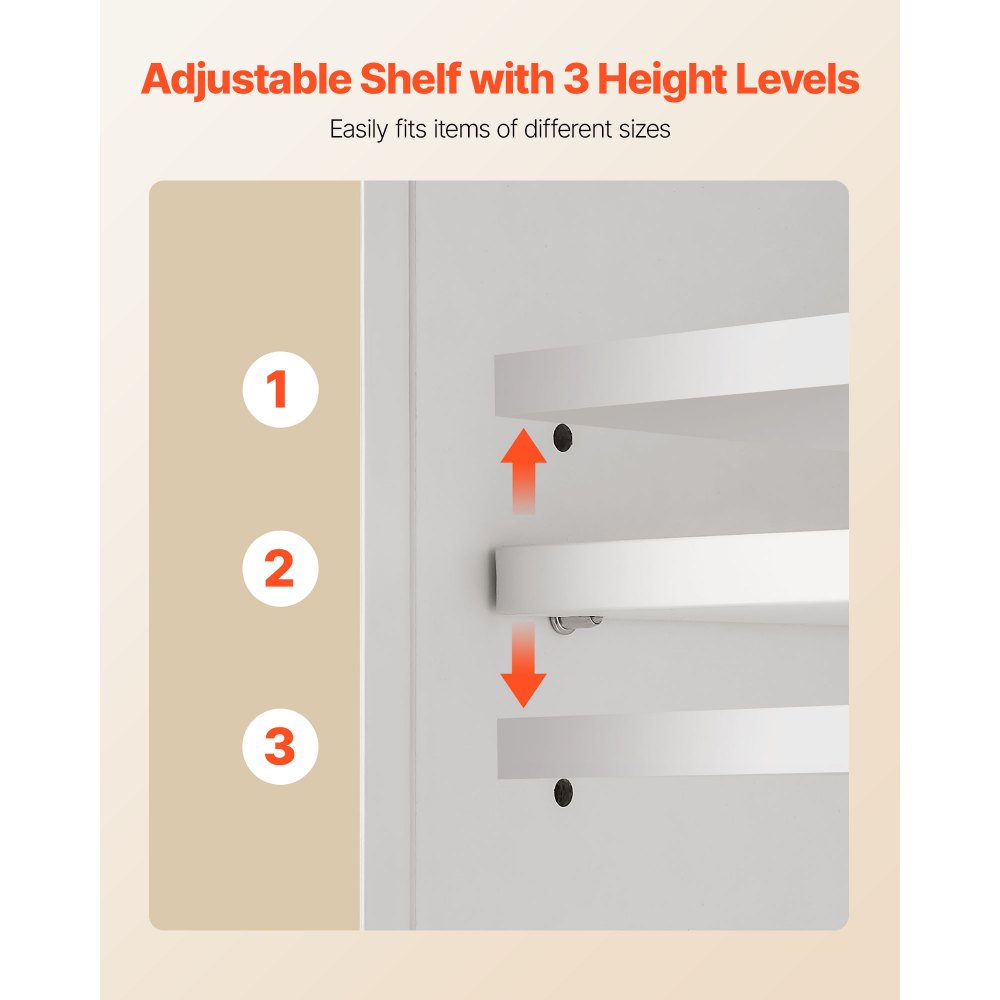 Estante ajustable: El botiquín de pared cuenta con un estante ajustable con 3 niveles de altura, lo que permite ajustarlo libremente para acomodar artículos de diferentes alturas. Su diseño flexible se adapta a diferentes necesidades de almacenamiento y optimiza el espacio del baño