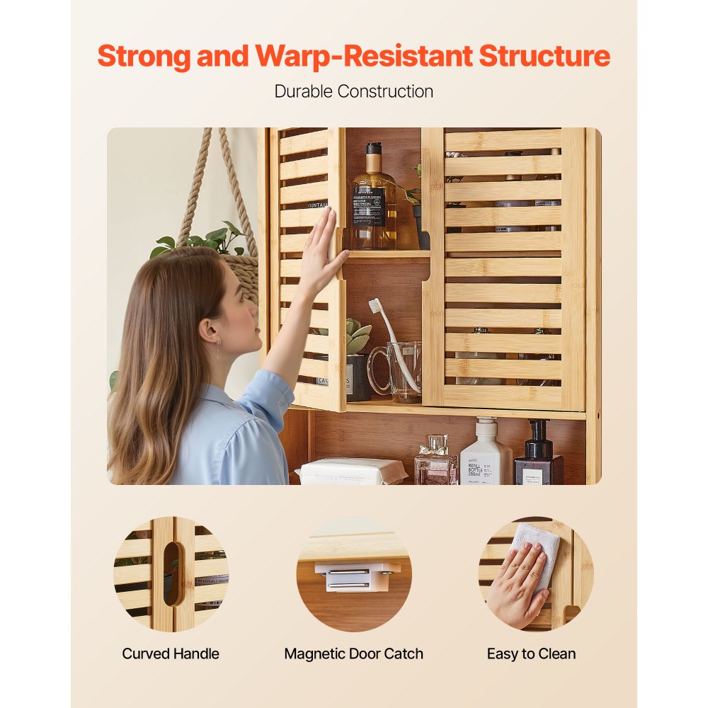 Estante ajustable: El mueble de baño de pared cuenta con un estante ajustable con 3 niveles de altura, lo que permite ajustar libremente la altura de los artículos. Su diseño flexible se adapta a diferentes necesidades de almacenamiento y optimiza el espacio del baño