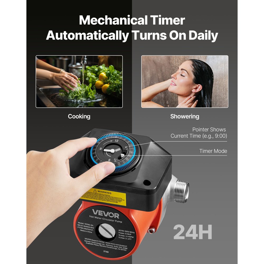 Temporizador programable: El temporizador mecánico integrado permite programar el funcionamiento de la bomba de circulación de agua caliente. Adapte el suministro de agua caliente a la rutina diaria de su hogar, garantizando comodidad y ahorrando energía