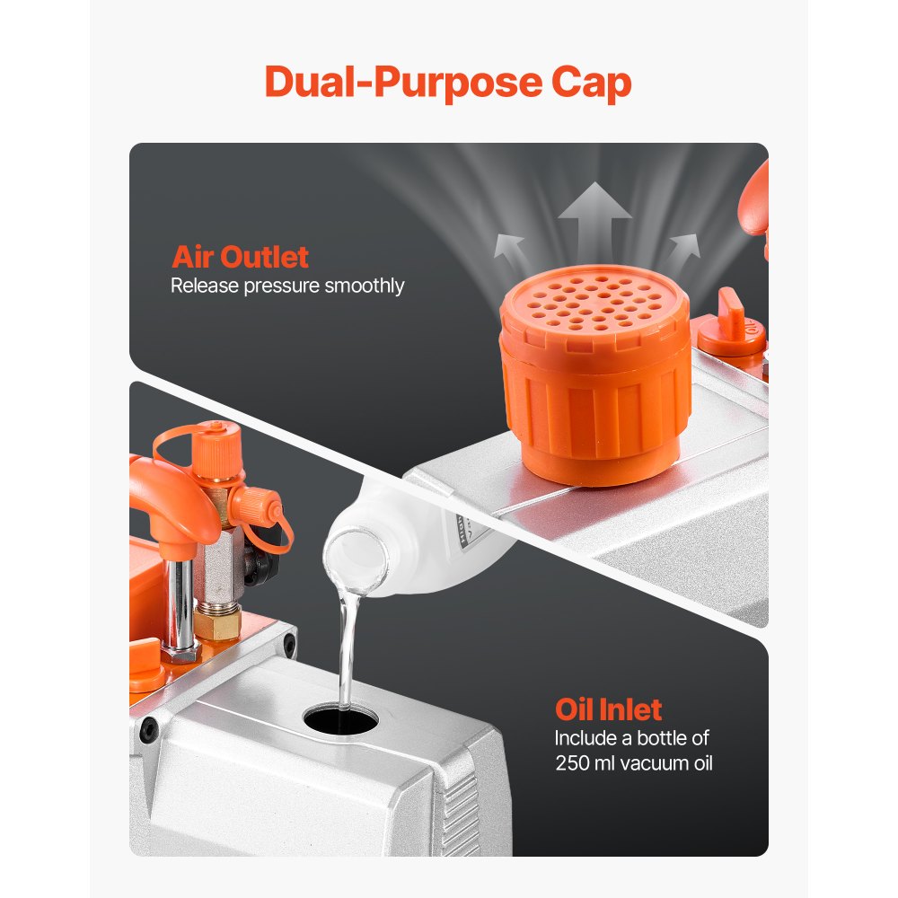 Diseño fácil de usar: Gracias a su capacidad de 250 ml de aceite y a su ventana transparente, comprobar el nivel de aceite es muy sencillo. Esta bomba de vacío para aire acondicionado incluye una botella de 250 ml de aceite para su uso inmediato