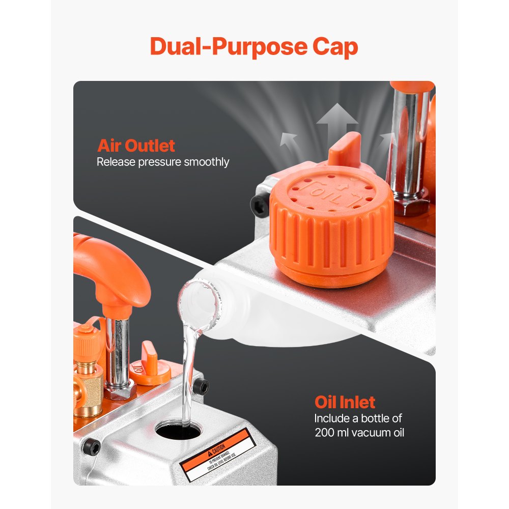 Diseño fácil de usar: Gracias a su capacidad de 200 ml de aceite y a su ventana transparente, comprobar el nivel de aceite es muy sencillo. Esta bomba de vacío para aire acondicionado incluye una botella de 200 ml de aceite lista para usar
