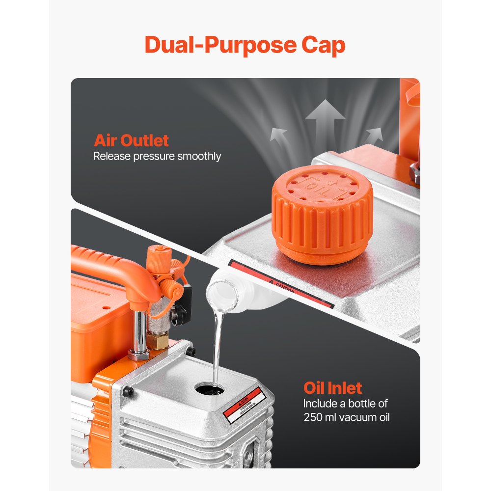 Diseño fácil de usar: Gracias a su capacidad de 250 ml de aceite y a su ventana transparente, comprobar el nivel de aceite es muy sencillo. Esta bomba de vacío para aire acondicionado incluye una botella de 250 ml de aceite para su uso inmediato