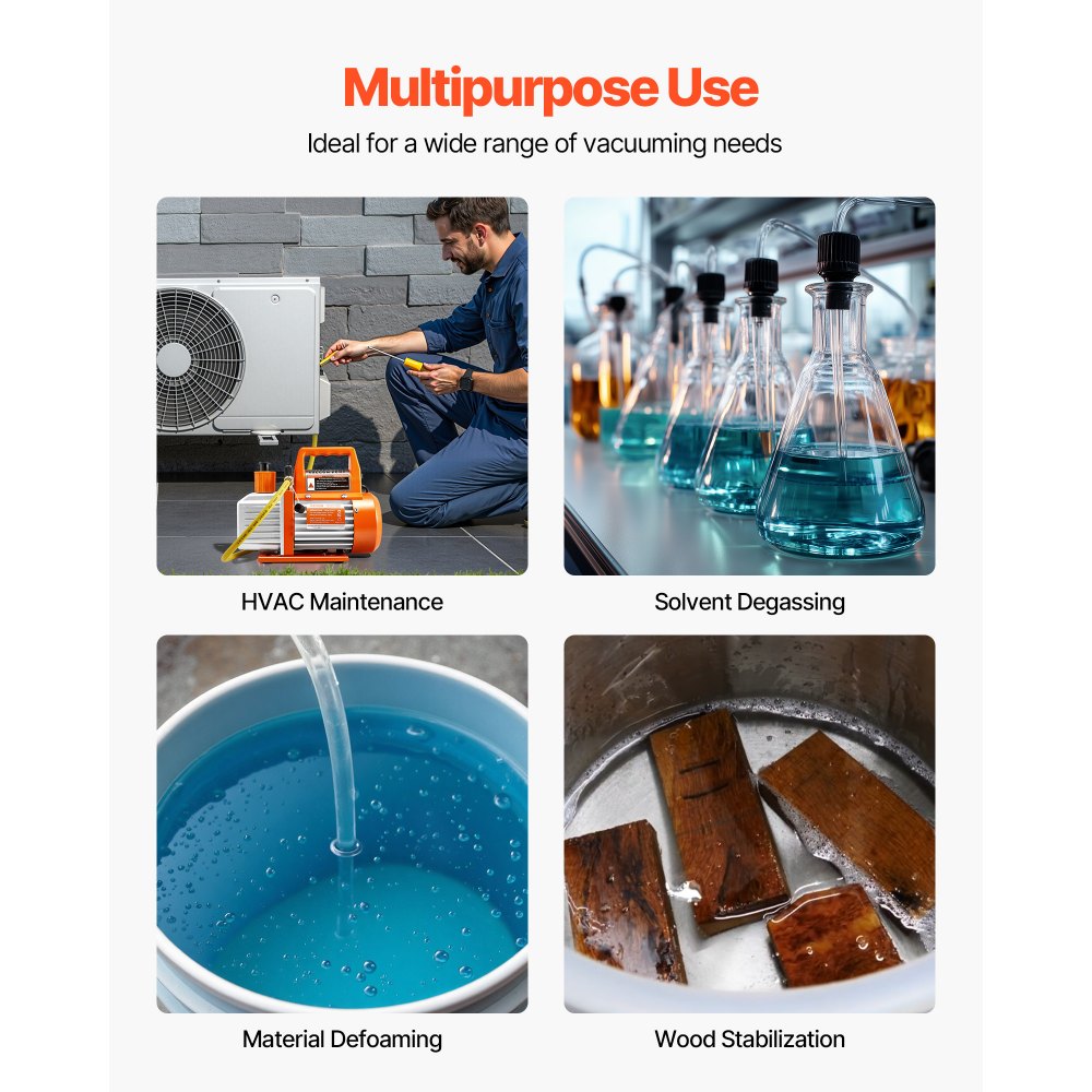 Versátil para cualquier trabajo: Ya sea que esté trabajando en mantenimiento de refrigeración, reparaciones de HVAC, desgasificación de resina, estabilización de madera o más, esta bomba de vacío es ideal para aplicaciones comerciales y residenciales