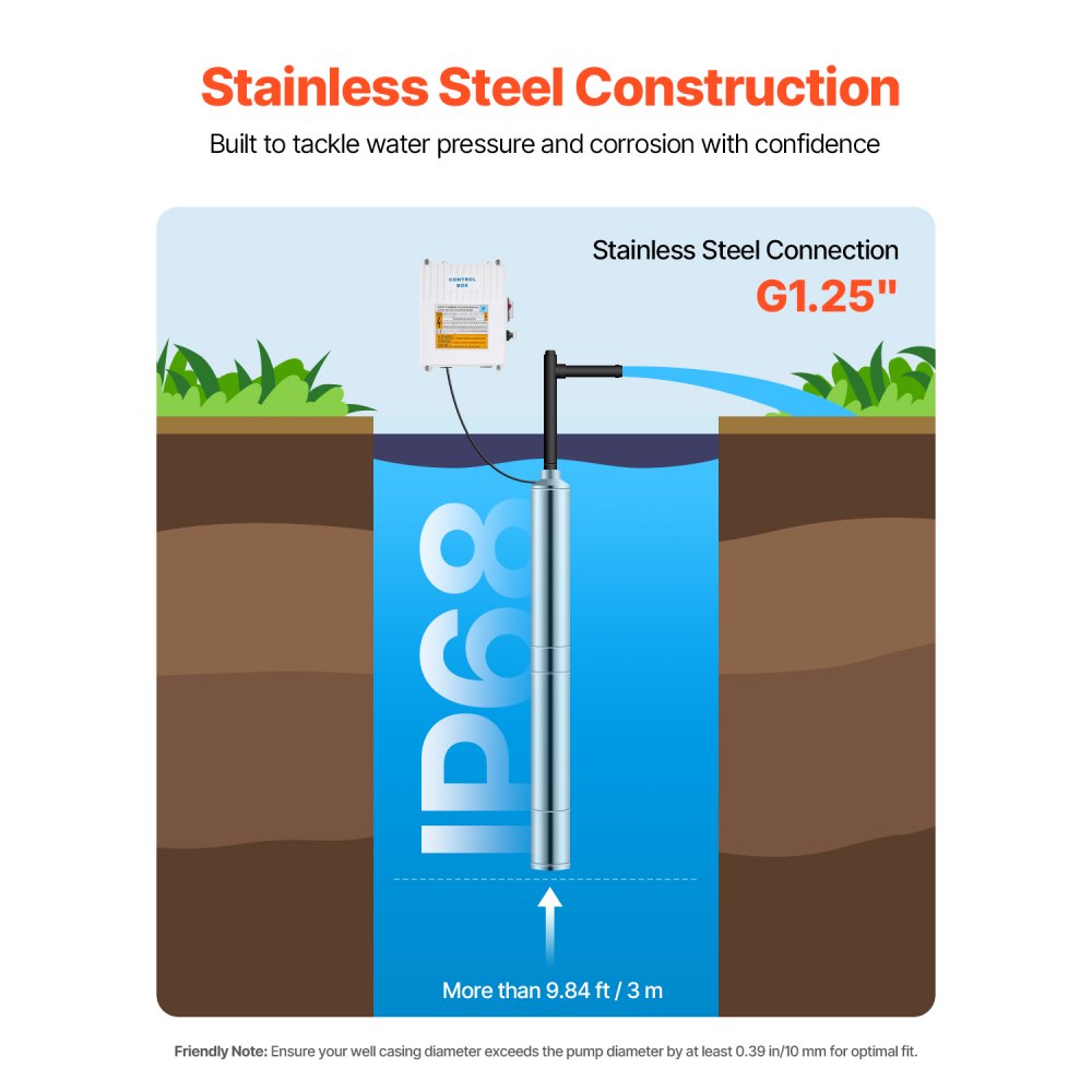 Fabricada para durar, resistente a la corrosión: Diseñada para durar, nuestra bomba sumergible para pozos profundos cuenta con una clasificación de impermeabilidad IP68 y está fabricada con conexión de acero inoxidable y malla de filtración. Esta construcción resistente a la corrosión resiste el óxido y mantiene los residuos afuera, lo que protege eficazmente el motor