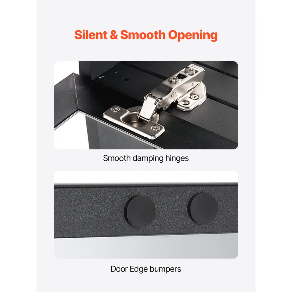 Características premium adicionales: Equipado con bisagras de alta calidad que amortiguan el ruido, este botiquín con espejo está diseñado para abrirse y cerrarse de manera suave y silenciosa. La superficie es resistente a los rayones y al óxido, mientras que las almohadillas de amortiguación incluidas reducen aún más el ruido, lo que mejora la experiencia general del usuario