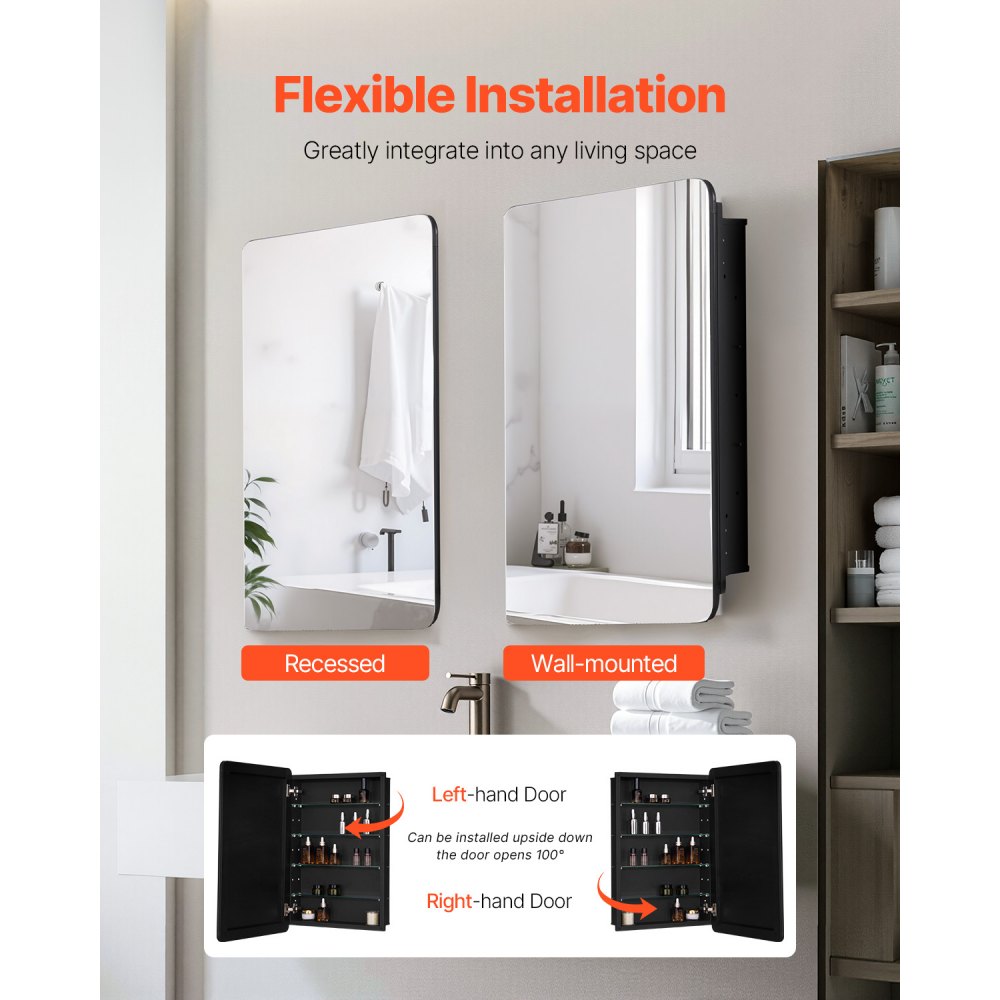 Montaje en pared o empotrado: El mueble con espejo para baño ofrece dos métodos de instalación(montaje en pared o empotrado) y admite la instalación al revés, lo que le permite cambiar la dirección de apertura de la puerta. Elija la opción más adecuada en función del diseño de su baño y sus preferencias personales para lograr un uso óptimo del espacio