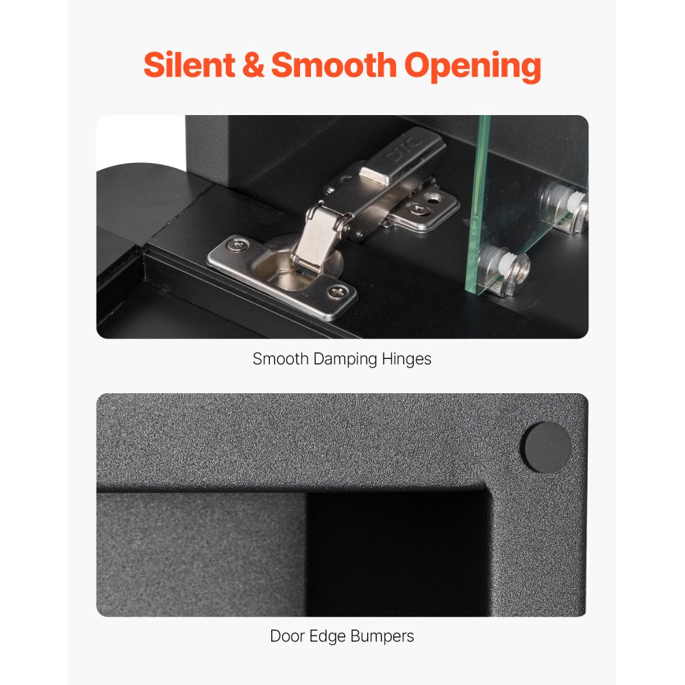 Características premium adicionales: Equipado con bisagras de alta calidad que amortiguan el ruido, este botiquín con espejo está diseñado para abrirse y cerrarse de manera suave y silenciosa. La superficie es resistente a los rayones y al óxido, mientras que las almohadillas de amortiguación incluidas reducen aún más el ruido, lo que mejora la experiencia general del usuario