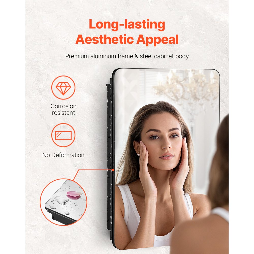 Materiales estéticos y duraderos: Fabricado con un marco de acero inoxidable negro de primera calidad y un marco de puerta de aluminio, este botiquín con espejo para baño ofrece una resistencia superior al óxido, lo que lo hace ideal para espacios húmedos. Su durabilidad duradera garantiza que no se deforme con el uso, mientras que el diseño contemporáneo y los bordes biselados agregan un toque elegante y seguro que evita cualquier daño