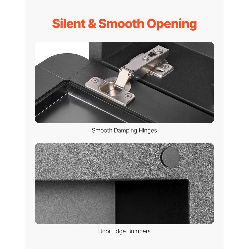 Características premium adicionales: Equipado con bisagras de alta calidad que amortiguan el ruido, este botiquín con espejo está diseñado para abrirse y cerrarse de manera suave y silenciosa. La superficie es resistente a los rayones y al óxido, mientras que las almohadillas de amortiguación incluidas reducen aún más el ruido, lo que mejora la experiencia general del usuario