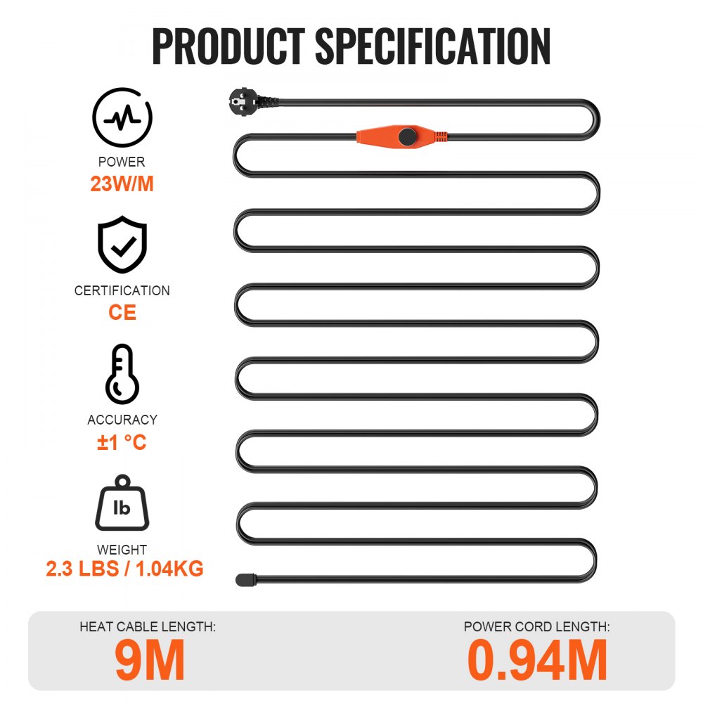 Longitud perfecta: Nuestro cable calefactor de 9 m para tuberías tiene un cable de alimentación de 0,94 m, lo que le permite funcionar a largas distancias. Fabricado con núcleo calefactor de fibra de vidrio, aislamiento de PVC, blindajes trenzados de alambre de cobre y cubierta protectora de PVC, este cable calefactor ofrece alta seguridad y un rendimiento duradero en duras condiciones invernales.