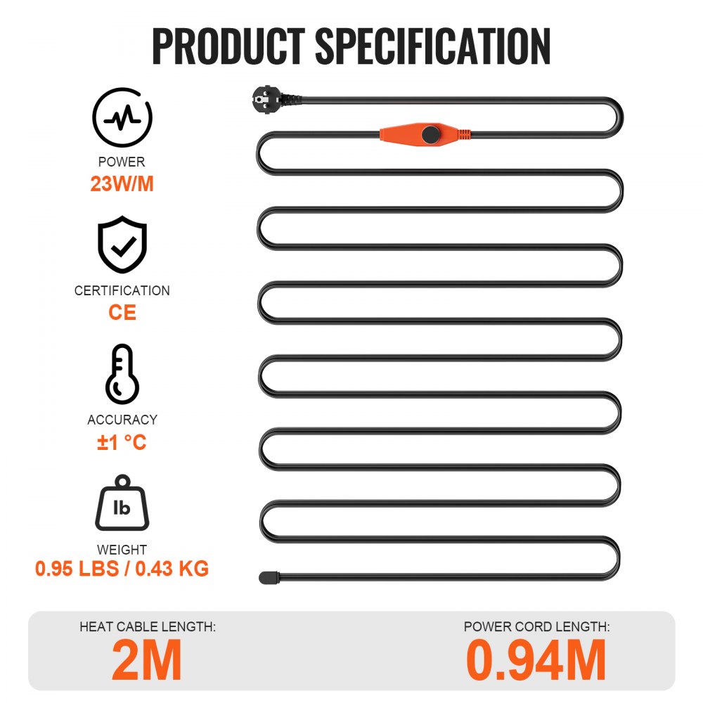 Longitud perfecta: Nuestro cable calefactor de 2 m para tuberías tiene un cable de alimentación de 0,94 m, lo que garantiza una mayor flexibilidad. Fabricado con un núcleo calefactor de fibra de vidrio, aislamiento de PVC, blindajes trenzados de alambre de cobre y cubierta protectora de PVC, este cable calefactor ofrece alta seguridad y un rendimiento duradero en duras condiciones invernales.
