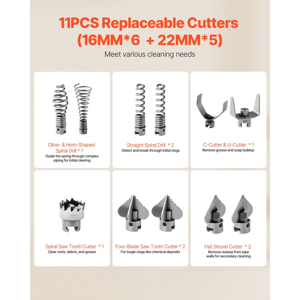 11 cortadores intercambiables: Equipado con un versátil juego de cabezales de limpieza (16 mm x 6 / 22 mm x 5) que se cambian fácilmente para eliminar diferentes tipos de obstrucciones. Desde pequeñas obstrucciones cotidianas hasta obstrucciones persistentes, nuestro limpiador de desagües se encarga de ello con rapidez y eficiencia