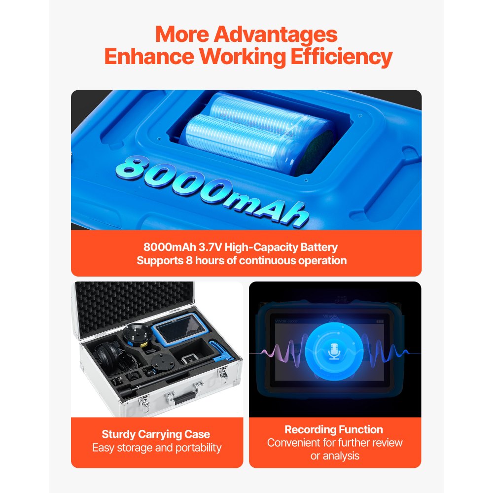 Mayor autonomía: Alimentado por una batería de alta capacidad de 8000 mAh y 3,7 V, este detector de fugas de agua para exteriores ofrece hasta 8 horas de funcionamiento continuo. Incluye una tarjeta SD de 8 GB para almacenamiento de datos y un resistente estuche de transporte para un transporte cómodo