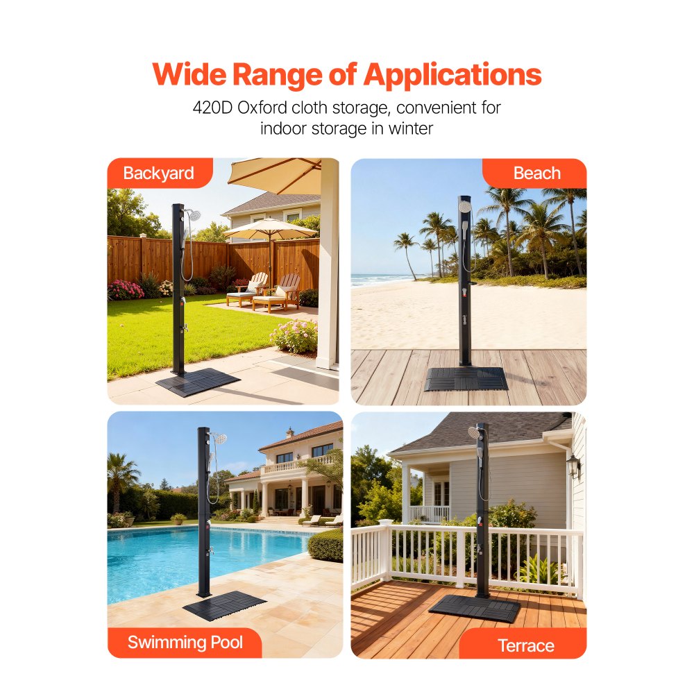 Disfrutar de las duchas al aire libre: Ideal para enjuagarse antes o después de nadar o refrescarse en días calurosos; ideal para usar en el jardín, la playa, la piscina o el patio; viene con una cubierta Oxford 420D para protegerse contra el clima; también se recomienda almacenamiento en interiores durante los meses más fríos