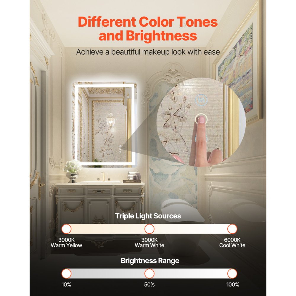 Luz LED ajustable y función de memoria: Este espejo de tocador de baño con luz LED cuenta con controles táctiles inteligentes para cambiar entre tres temperaturas de color: amarillo cálido(3000 K), blanco cálido(3000 K) y blanco frío(6000 K), y ofrece un ajuste de brillo continuo del 10 % al 100 %. La función de memoria guarda sus últimas configuraciones, lo que garantiza una iluminación precisa para su próximo uso sin necesidad de reajustes