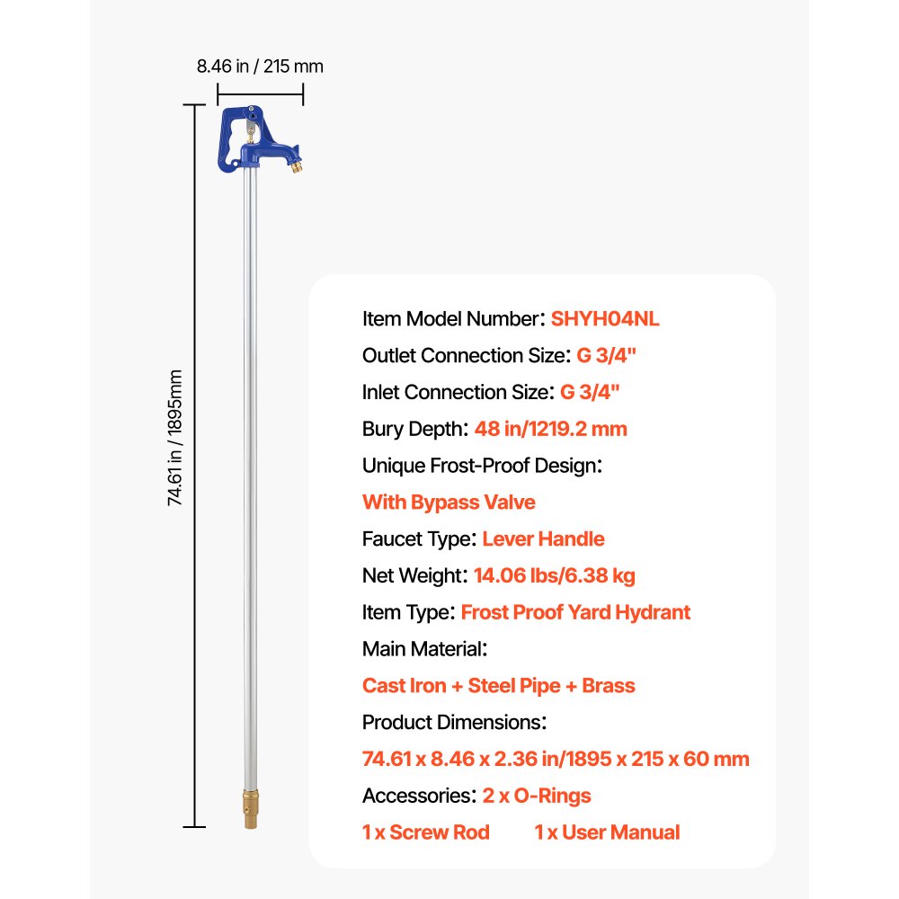 Suministro de agua corriente: Este hidrante de jardín resistente a las heladas tiene una longitud total de 1895 mm y una profundidad de enterramiento de 1219,2 mm para proteger eficazmente las tuberías de la congelación. Ideal para riego de jardines, lavado de coches, riego agrícola y cuidado del césped (no se recomienda para beber)