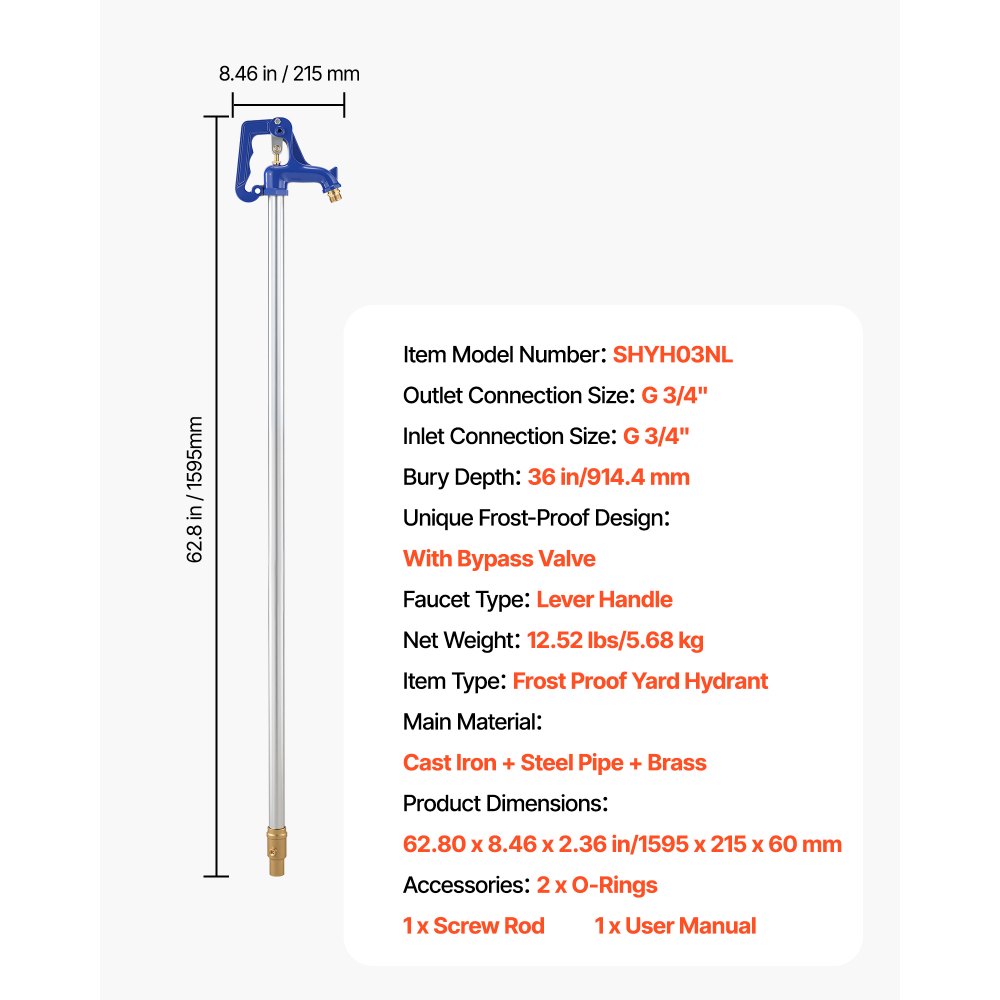 Suministro de agua corriente: Este hidrante de jardín resistente a las heladas tiene una longitud total de 1595 mm y una profundidad de enterramiento de 914,4 mm para proteger eficazmente las tuberías de la congelación. Ideal para riego de jardines, lavado de coches, riego agrícola y cuidado del césped (no se recomienda para beber)