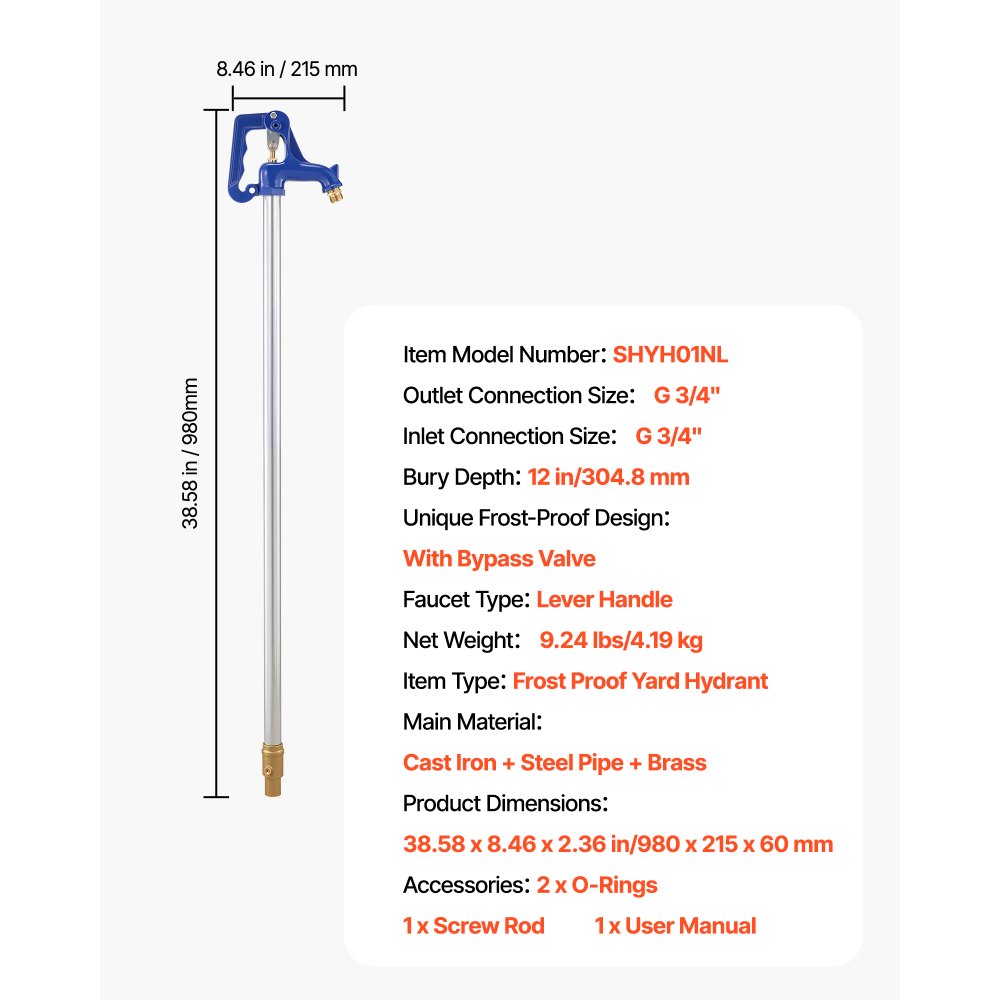 Hidrante Resistente a las Heladas, 980 mm, Hidrante sin Plomo para Riego de Jardines y Granjas, Profundidad de Enterramiento 304,8 mm, Conexión de Tubo G 19,05 mm y Acoplamiento de Manguera - Fontanería