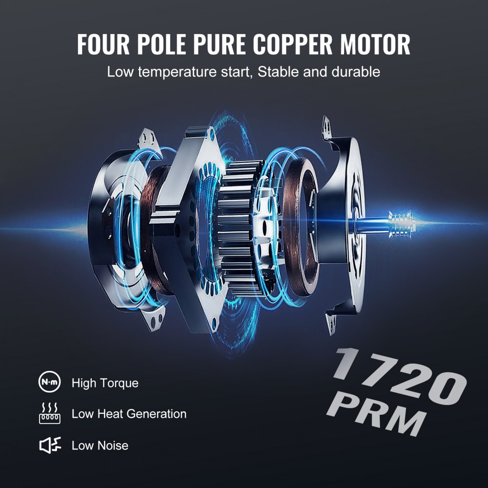 Motor de cobre puro de 4 polos: El motor tiene un alto par para un funcionamiento más eficiente. El disipador de calor en forma de T y el ventilador de enfriamiento ayudan al motor de cobre puro a disipar el calor de manera efectiva, lo que le permite funcionar continuamente durante más de 2 horas. Y con protección adicional contra sobrecalentamiento, puede disfrutar de un rendimiento estabilizado y una vida útil más larga para su motor.