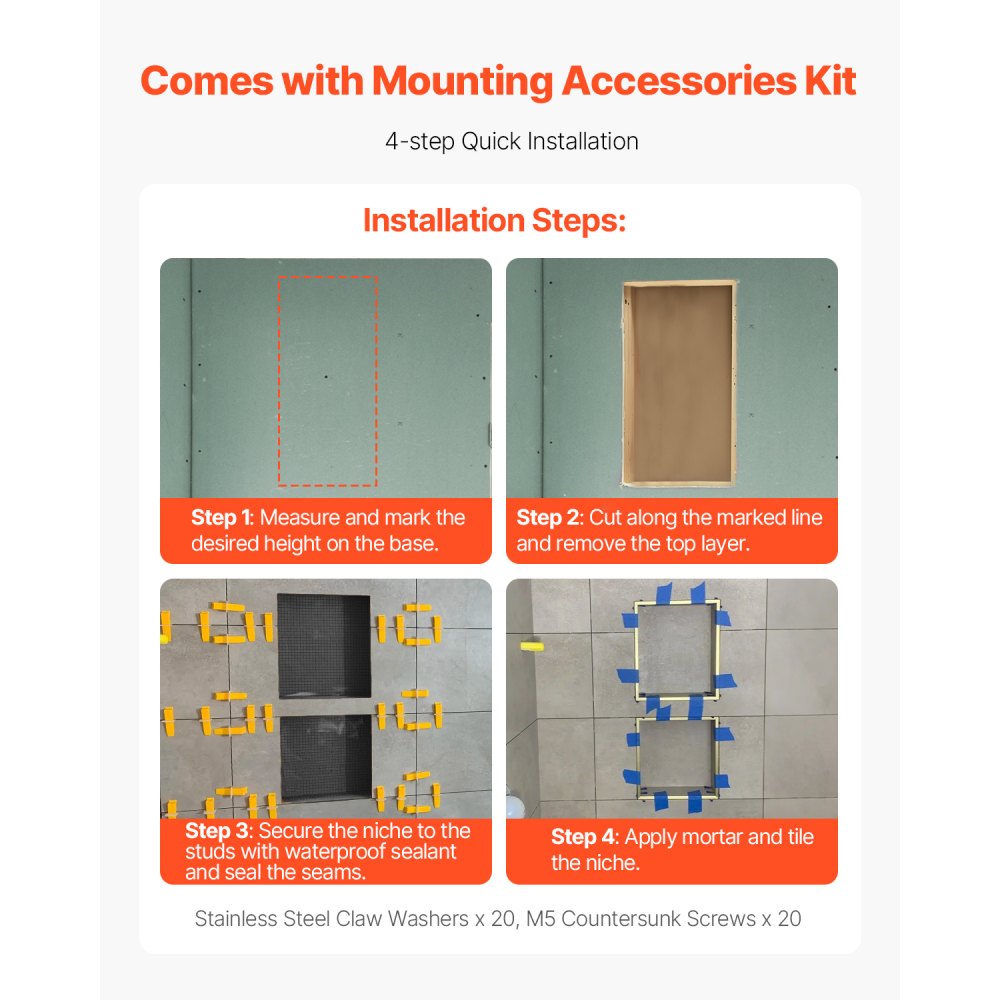 Fácil instalación: Incluye un kit de accesorios para instalación empotrada horizontal o vertical. Solo siga estos pasos: Paso 1: Determine la altura necesaria y dibuje una línea horizontal en la capa base. Paso 2: Corte a lo largo de la línea y retire la capa base superior. Paso 3: Use sellador impermeable para fijar el nicho a los montantes y sellar las juntas. Paso 4: Aplique mortero y fije las baldosas elegidas