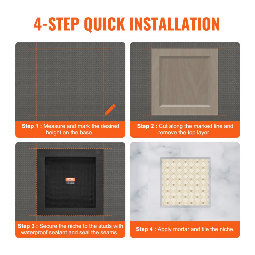 Sellado y 100% resistente al agua: El nicho de ducha VEVOR utiliza tablero de espuma extruido XPS, mortero de cemento, revestimiento impermeable, sustrato triple impermeable, 100% sellado e impermeable, que no solo protege la pared y prolonga su vida, sino que también previene eficazmente la penetración de agua en la pared, para mantener el interior seco e higiénico.
