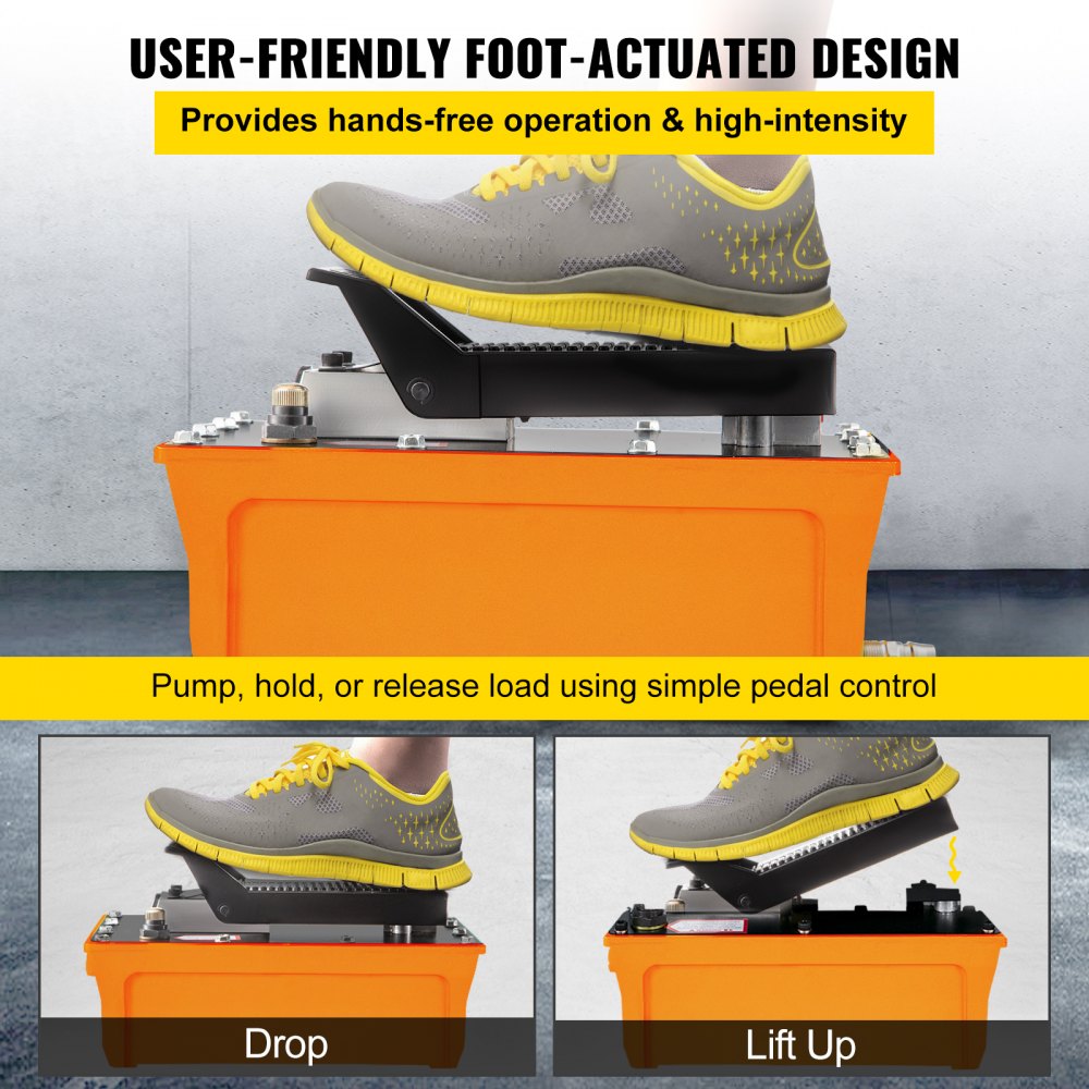 【DISEÑO ACTUADO POR EL PIE】- La bomba de aire sobre hidráulica proporciona una operación de manos libres para bombear y liberar la carga. La función de bloqueo de liberación bloquea el pedal en la posición de liberación sin tener que pisar el pedal.