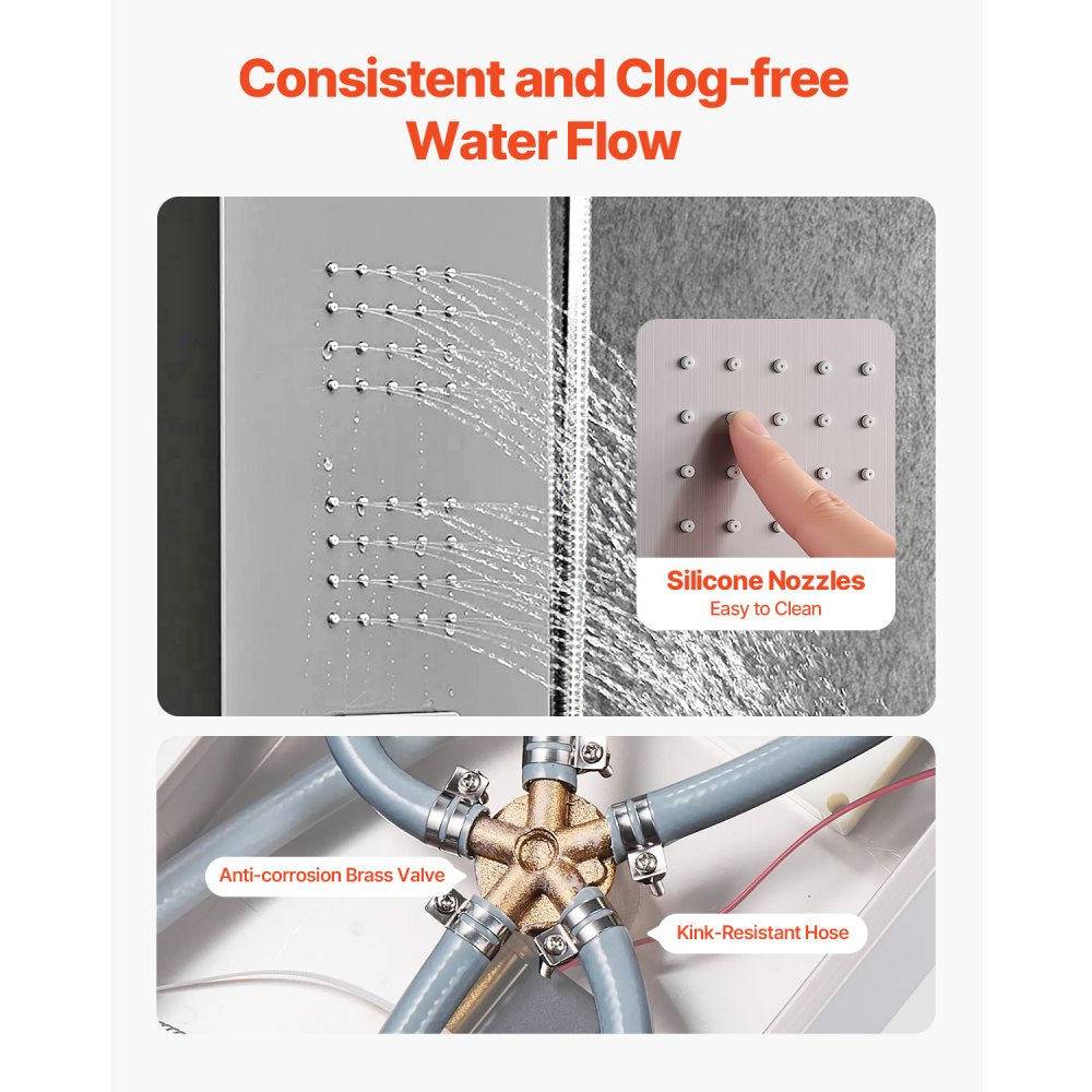 Flujo de agua suave y estable: La exclusiva estructura de la válvula mezcladora de latón proporciona una alta resistencia a la presión del agua y previene fugas y la oxidación. Las boquillas de silicona de la columna de ducha de acero inoxidable son fáciles de limpiar