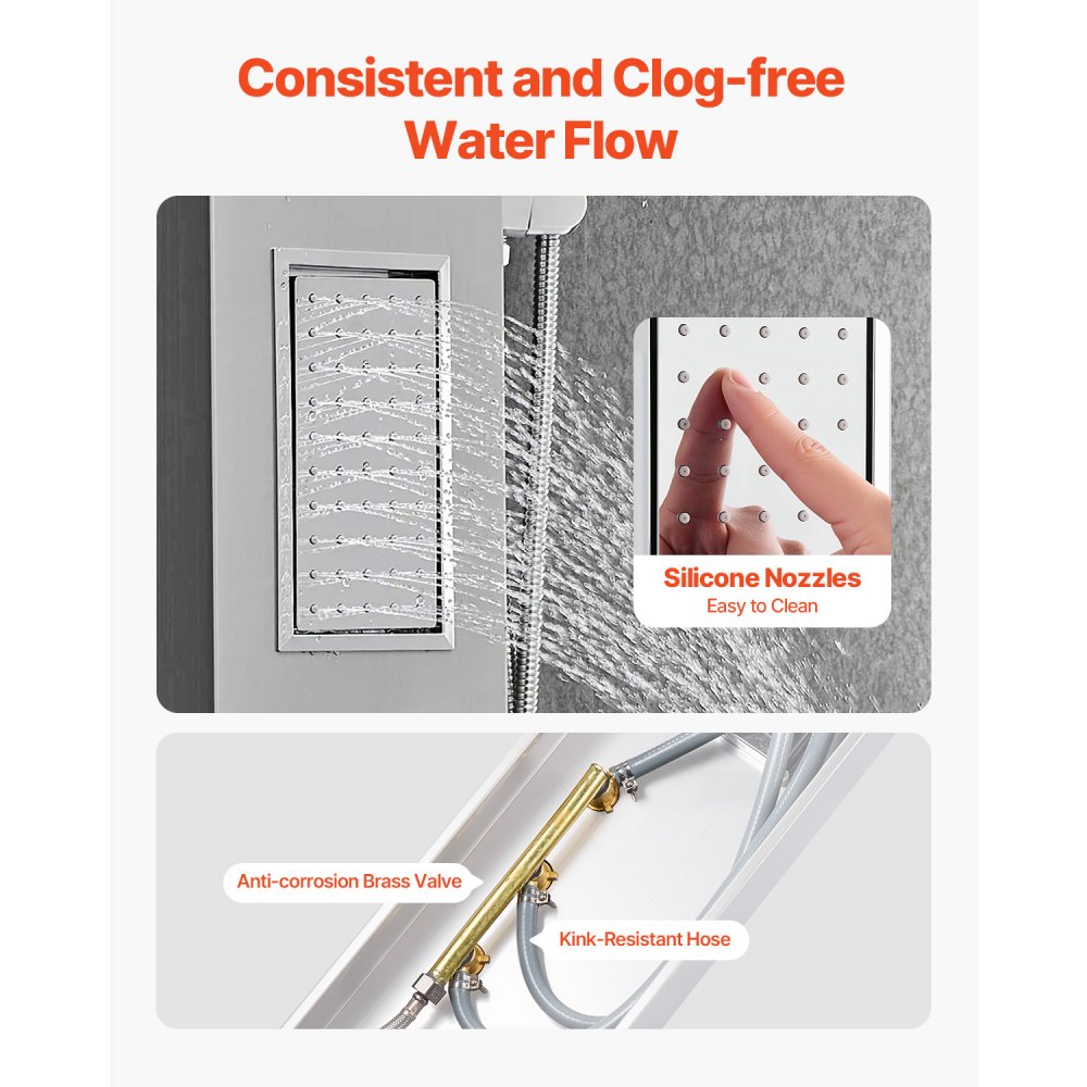 Flujo de agua suave y estable: La exclusiva estructura de la válvula mezcladora de latón proporciona una alta resistencia a la presión del agua y previene fugas y la oxidación. Las boquillas de silicona de la columna de ducha de acero inoxidable son fáciles de limpiar