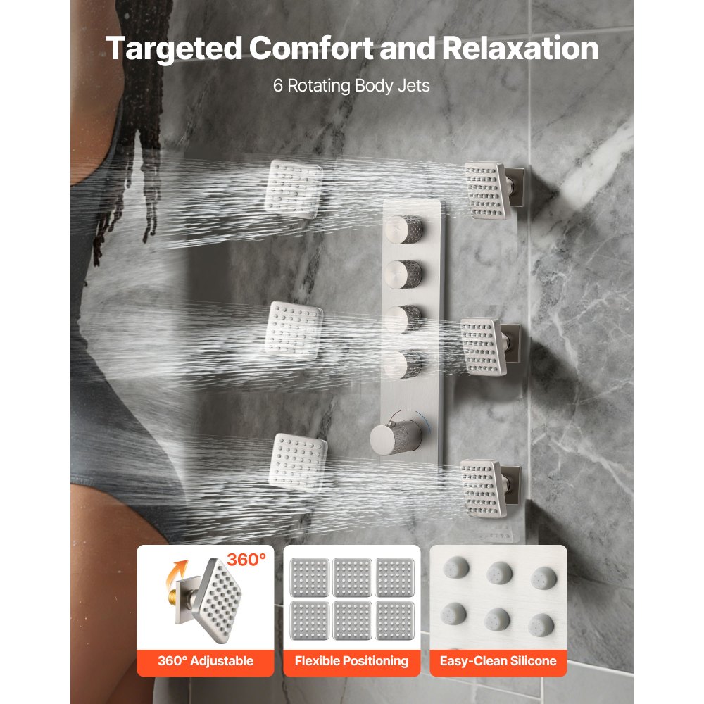 Fácil mantenimiento: El sistema de ducha cuenta con una válvula de latón macizo y un cartucho termostático de cerámica, lo que garantiza durabilidad y un rendimiento a prueba de fugas. Una placa de acero inoxidable 304 le aporta elegancia, mientras que las boquillas flexibles de silicona eliminan la cal