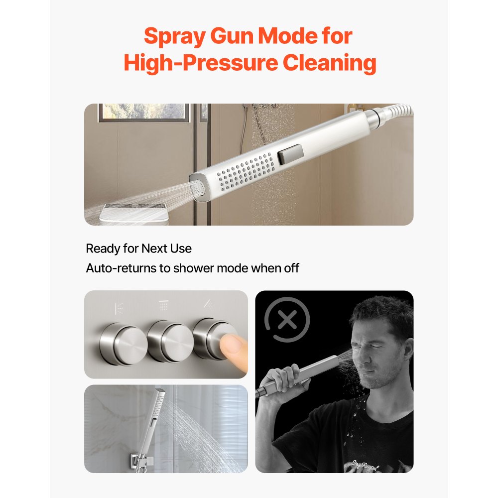 Fácil mantenimiento: Nuestro sistema de ducha cuenta con una elegante placa de acero inoxidable 304 resistente a la corrosión. Las boquillas flexibles de silicona permiten eliminar la cal para un flujo de agua uniforme