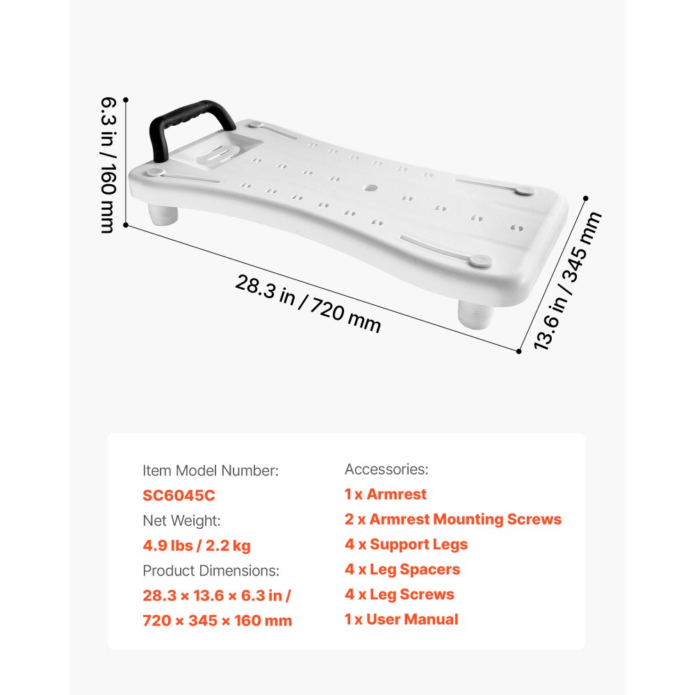 Silla de ducha 2 en 1: Esta tabla de bañera ajustable se puede usar como banco de transferencia para bañera o como tabla de baño para mayor versatilidad. Su diseño espacioso proporciona más espacio dentro de la bañera, lo que facilita y hace más cómodas las transferencias