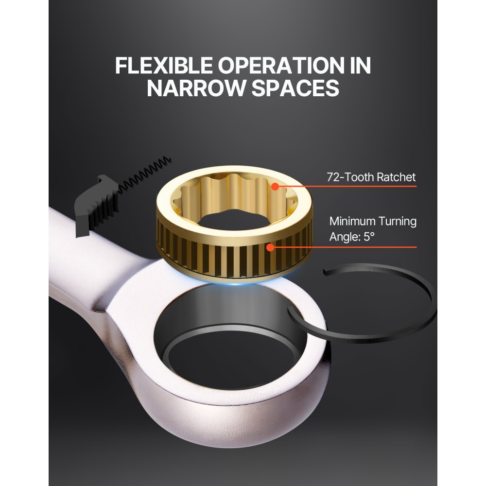 Trinquete de 72 dientes: Diseñado con 72 dientes, este juego de llaves de trinquete permite un ángulo de trabajo mínimo de solo 5°, lo que lo hace ideal para operaciones precisas y manejo suave, incluso en espacios reducidos