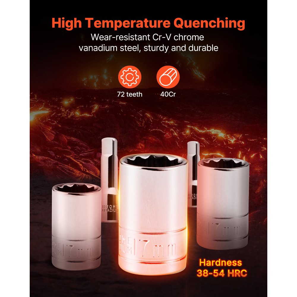Kit versátil para múltiples tareas: Ya sea para el mantenimiento del coche, bricolaje o reparación de equipos, este kit de herramientas para mecánicos tiene todo lo que necesita. Una amplia gama de tamaños de vasos y una construcción robusta garantizan un rendimiento estable y preciso en todo momento