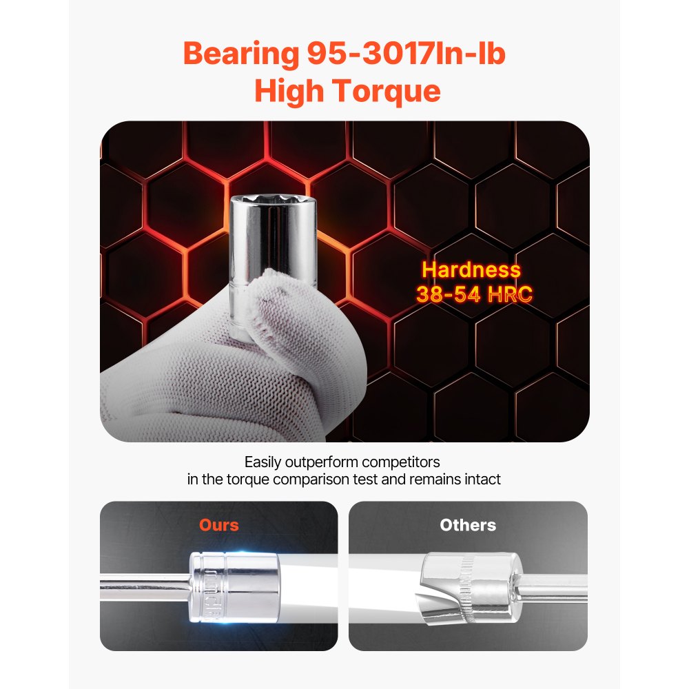 Alto par de 95 a 3017 in-lb: Afronte trabajos difíciles con confianza. Este juego de herramientas ofrece un par confiable para tareas como aflojar pernos apretados o instalar maquinaria. Sus materiales resistentes garantizan un rendimiento suave y constante