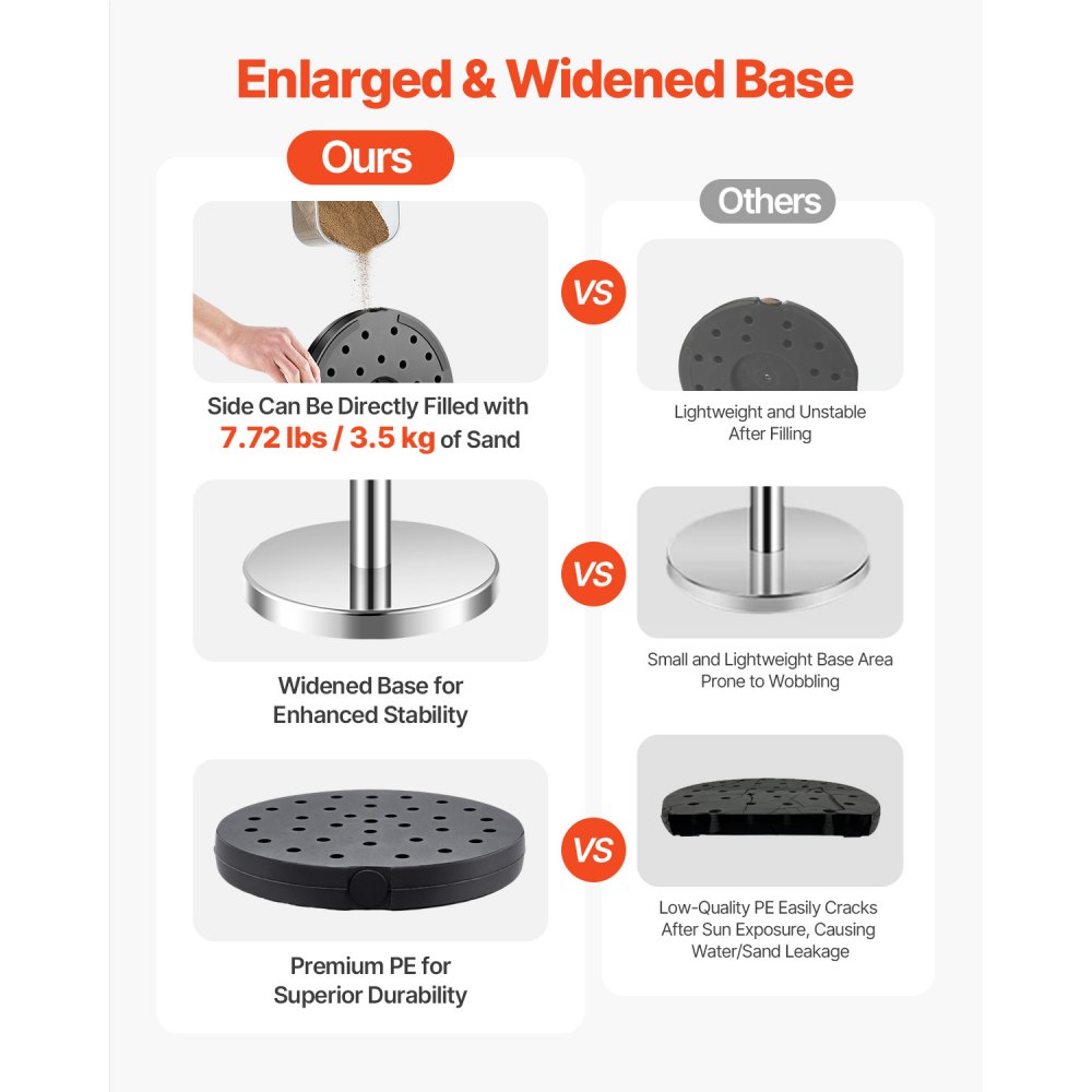 Resistente y segura: Con una base ancha y antideslizante y un diseño rellenable, nuestra barrera de control de multitudes está diseñada para durar. La base rellenable puede soportar hasta 7,72 lb/3,5 kg cuando se llena con arena, y resiste la luz solar directa y los impactos repentinos sin fallar