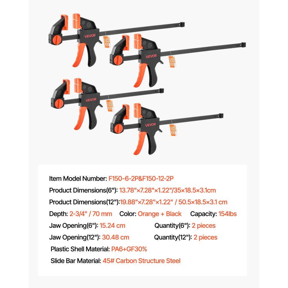Abrazaderas de Barra para Carpintería 2 PCS 30,48 cm 2 PCS 15,24 cm, Abrazadera/Separador de una Mano, Abrazadera en F de Agarre Rápido de Plástico y Acero Carga de 70 kg para Carpintería - Herramientas manuales