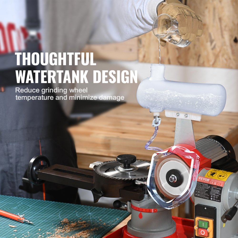 Cuchillas más afiladas, cortes más suaves: ¡Diga adiós a las cuchillas desafiladas! El potente afilador de hojas de sierra circular con inyección de agua VEVOR 370W, que funciona a una alta velocidad de 3600 RPM, afila eficazmente las hojas de sierra para devolverles su filo original, dejándolas afiladas, duraderas y sin rebabas.