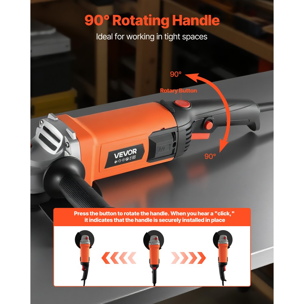 Diseño ergonómico: Compacta y ligera, esta amoladora angular portátil cuenta con un mango de goma que reduce la fatiga del usuario durante el uso prolongado. Su mango giratorio de 90° la hace ideal para espacios reducidos