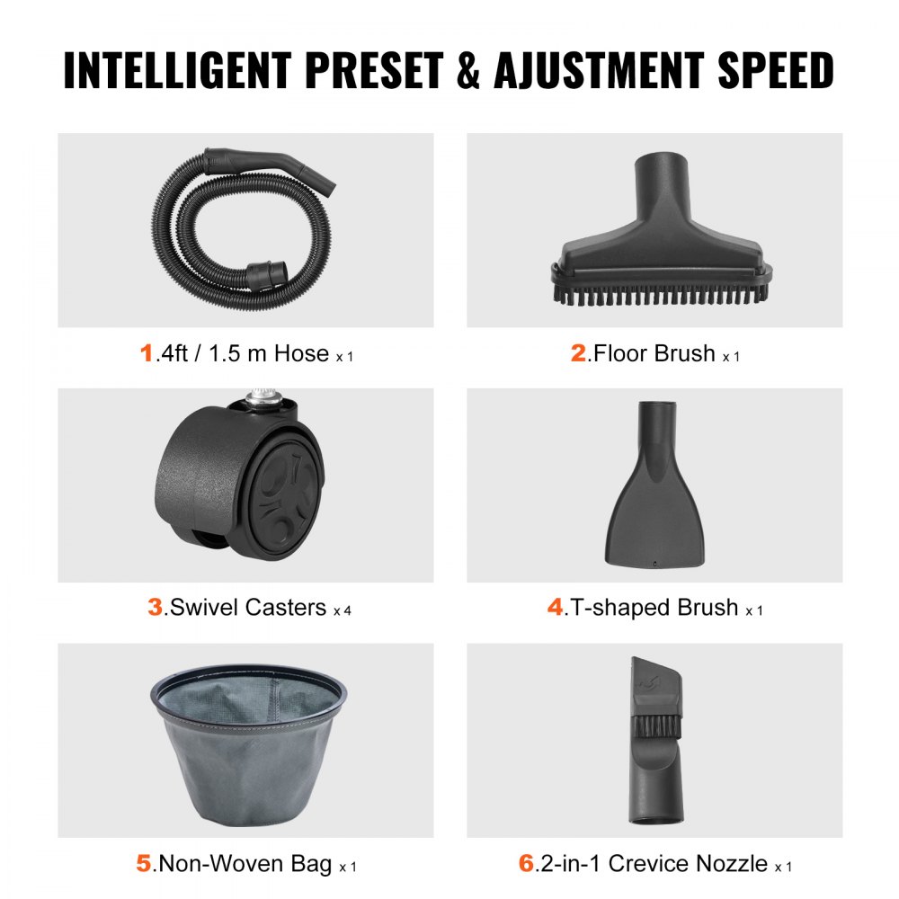 Succión imparable: Nuestra aspiradora en seco y húmedo le brinda una succión eficiente y al mismo tiempo permanece silenciosa durante operaciones de trabajo pesado gracias a su potente motor de 2,5 HP líder en la industria. Con su gran capacidad de 10 L, la aspiradora hace que la limpieza de todo su espacio sea muy sencilla, por lo que no necesita vaciar el balde con frecuencia. Está aprobado por ETL. Prepárate para hacer brillar habitaciones y espacios.