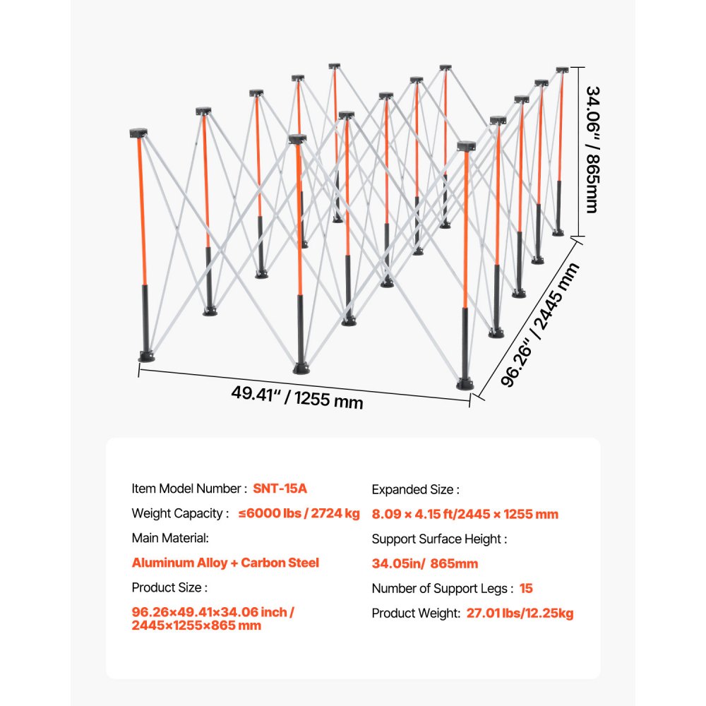 Robusto y estable: Fabricado con 15 soportes de aleación de aluminio y tubos reforzados, este soporte de trabajo plegable portátil soporta hasta 2726 kg (6000 lb). Ha superado pruebas de presión, lo que proporciona un soporte fiable para sus tareas y garantiza una larga durabilidad