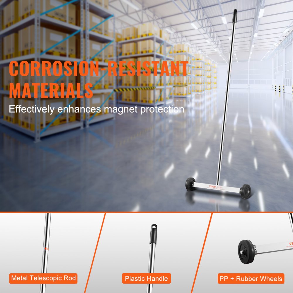 Ligero y portátil: la barredora magnética rodante de 15 pulgadas cuenta con un mango telescópico ajustable de 17,52 a 40,94 pulgadas (445-1040 mm) y pesa solo 12,37 libras. Ahorra espacio y es perfecta para áreas estrechas, ideal para recolectar clavos o piezas metálicas pequeñas en hogares, espacios pequeños o patios.