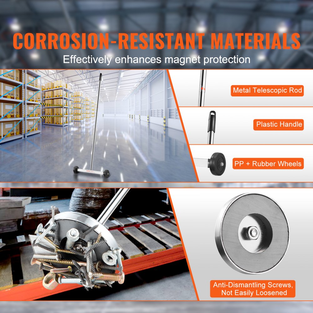 Poder magnético superior: la barredora magnética con ruedas VEVOR incluye una barredora magnética de 15'' con ruedas y una herramienta de recolección magnética telescópica de 3,2'', capaz de sostener hasta 8 libras (15'') y 35 libras (3,2'') respectivamente. Recoge sin esfuerzo clavos, tornillos y desechos de metal negro, protegiéndolo de fragmentos y metales afilados.