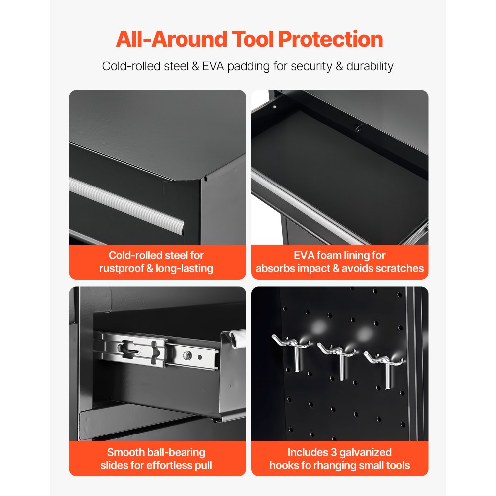 Protección íntegramente de acero y EVA: Fabricado en acero laminado en frío con recubrimiento en polvo, este armario de herramientas móvil resiste la corrosión, la oxidación y el desgaste. El acolchado de EVA integrado reduce la vibración, el ruido y las colisiones con herramientas metálicas