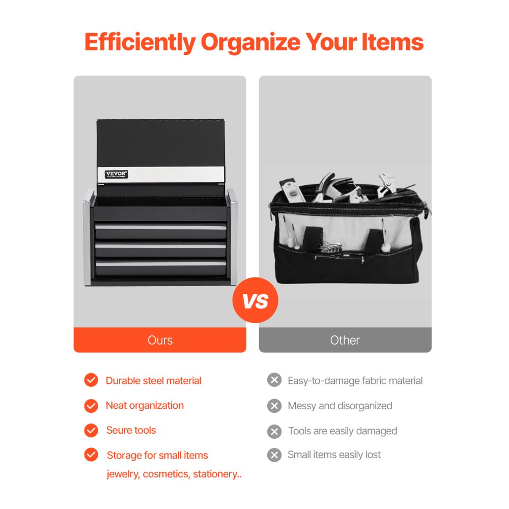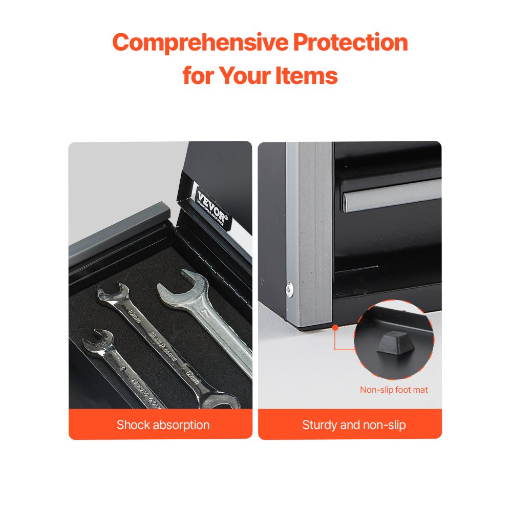 Organización eficiente: La caja de herramientas de metal está diseñada con múltiples capas, lo que hace un uso completo del espacio vertical para almacenar más artículos. La caja superior y los cajones le permiten organizar diferentes artículos de manera ordenada para un fácil acceso. El acolchado protector incorporado minimiza el ruido por deslizamiento o colisión, lo que brinda protección adicional para evitar rayones e impactos, lo que mejora la seguridad